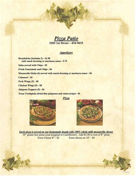 What is Pizza Patio's menu, you may ask? Well, it's a selection of pizzas, calzones, salads, and appetizers that are perfect for any occasion. The menu includes classic pizzas like Margherita and Pepperoni, as well as more unique options like Thai Chicken and Mediterranean.